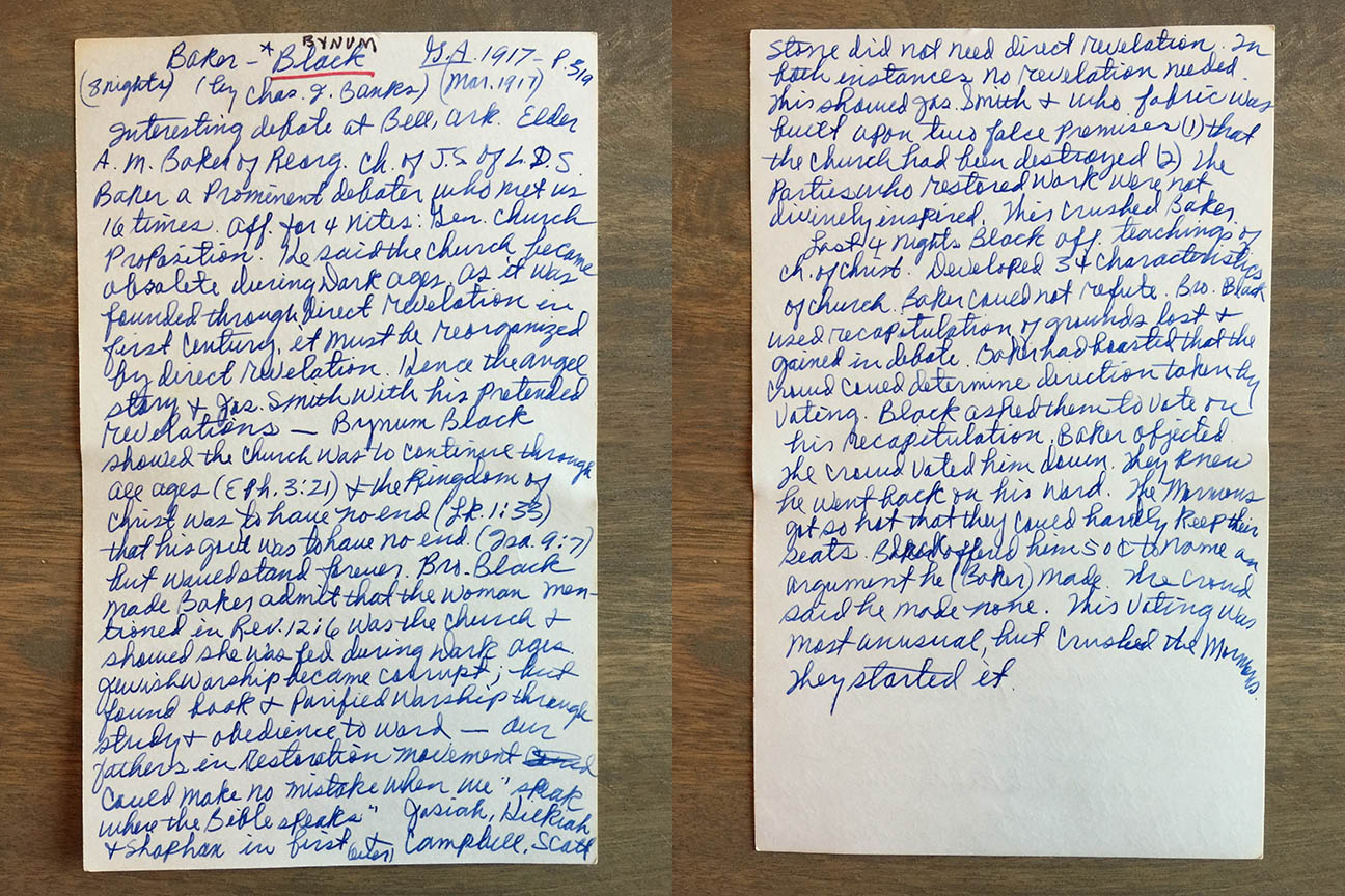 Bynum Black showed the church was to continue through all ages (Ephesians 3:21) and the Kingdom of Christ was to have no end (Luke 1:33) that his government was to have no end (Isaiah 9:7) but would stand forever. Bro. Black made Baker admit that the woman mentioned in Revelation 12:6 was the church and showed she was fed during Dark Ages. Jewish worship became corrupt; but found book and purified worship through study and obedience to word - - our fathers in restoration movement could make no mistake when we "speak where the Bible speaks". Josiah, Hilkiah and Shaphan in first and Campbell, Scott, and Stone did not need direct revelation. In both instances no revelation needed. This showed Joseph Smith and who fabric was built upon two false premises (1) that the church had been destroyed, (2) the parties who restored work were not divinely inspired. This crushed Baker.