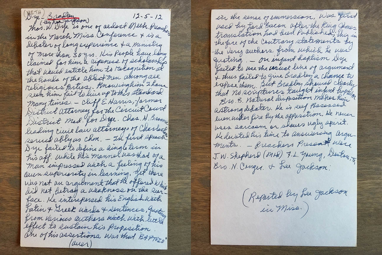 Thomas W. Dye is one of the oldest Methodist preachers in the North Mississippi Conference and is a debater of long experience and a ministry of more than 30 years. His people have long claimed for him a ripeness of scholarship that would entitle him to recognition at the hands of the ablest men among all religious parties. Knowing him, I have seen him fail to live up to this standard many times.